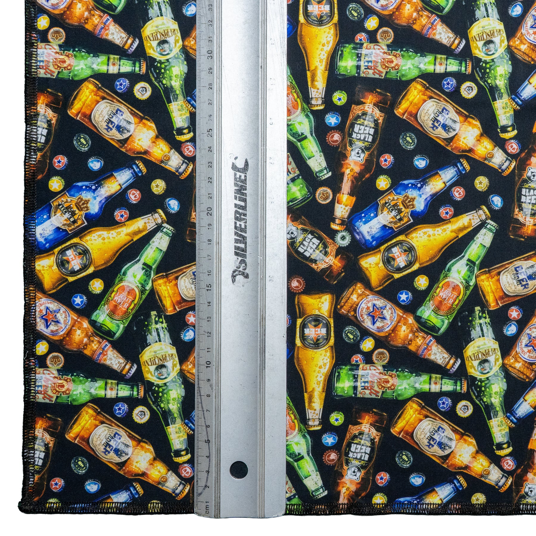 Fun design with a mass of beer bottles in yellow, green, blue & red all with their caps off.  Printed on a black cotton fabric, great fabric which we have made into our handmade square bandana approx. 21.5" x 21.5" machine washable 100% cotton