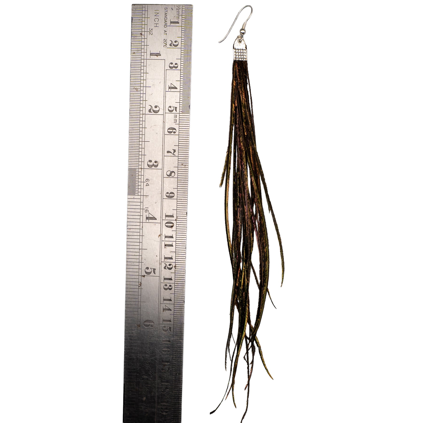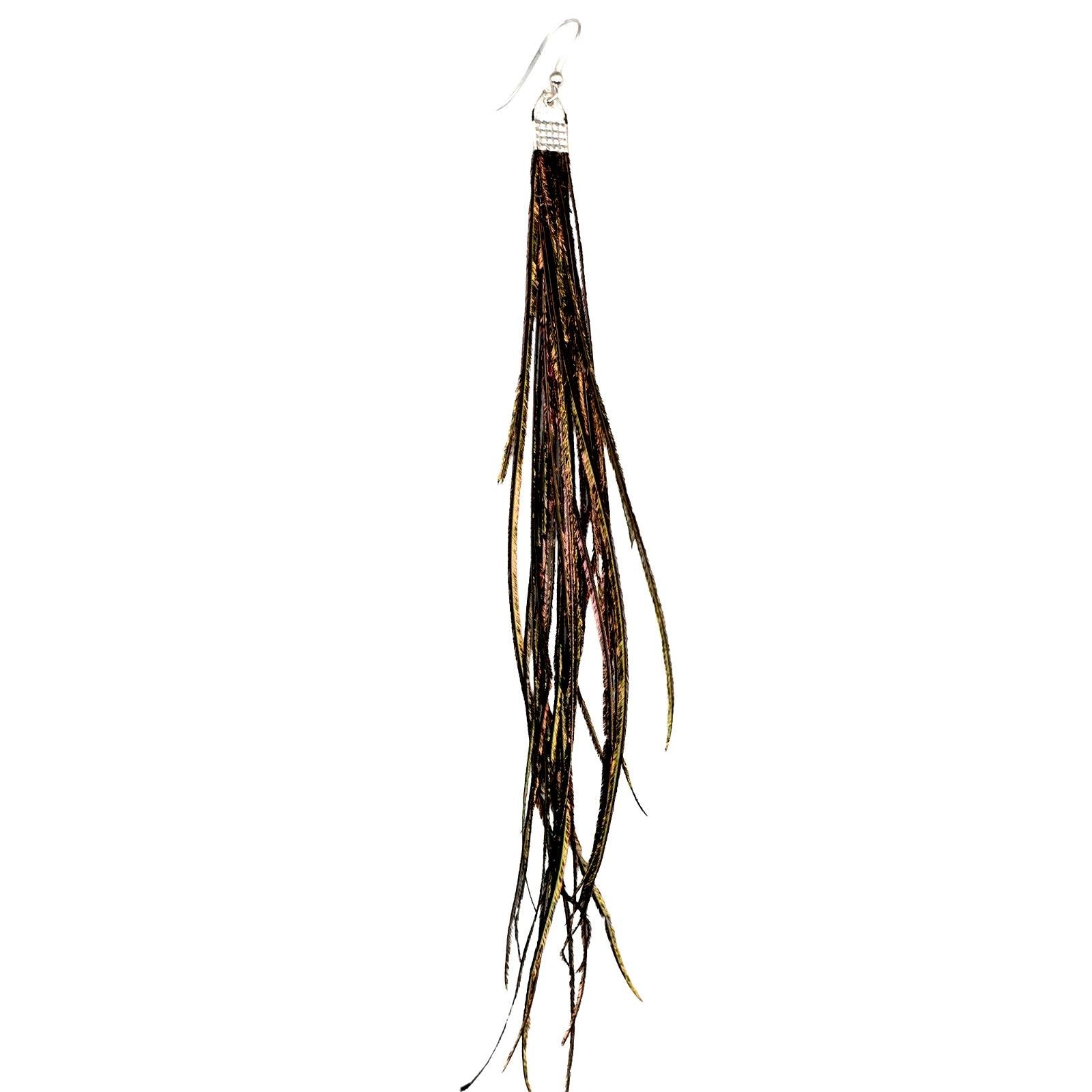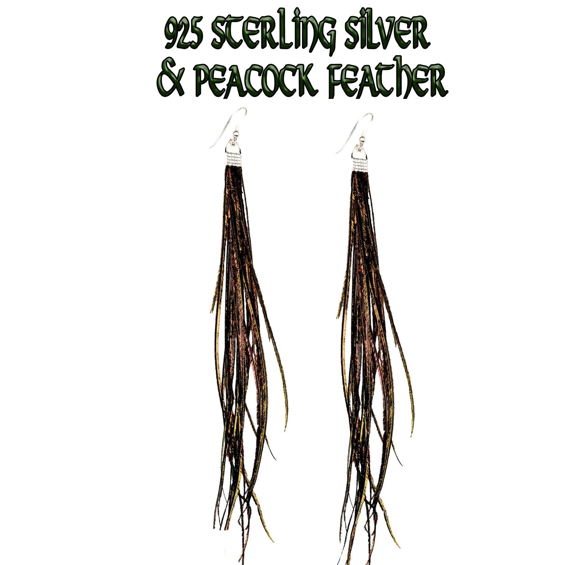 Real Peacock Feather Strand Earrings - 925 Sterling Silver