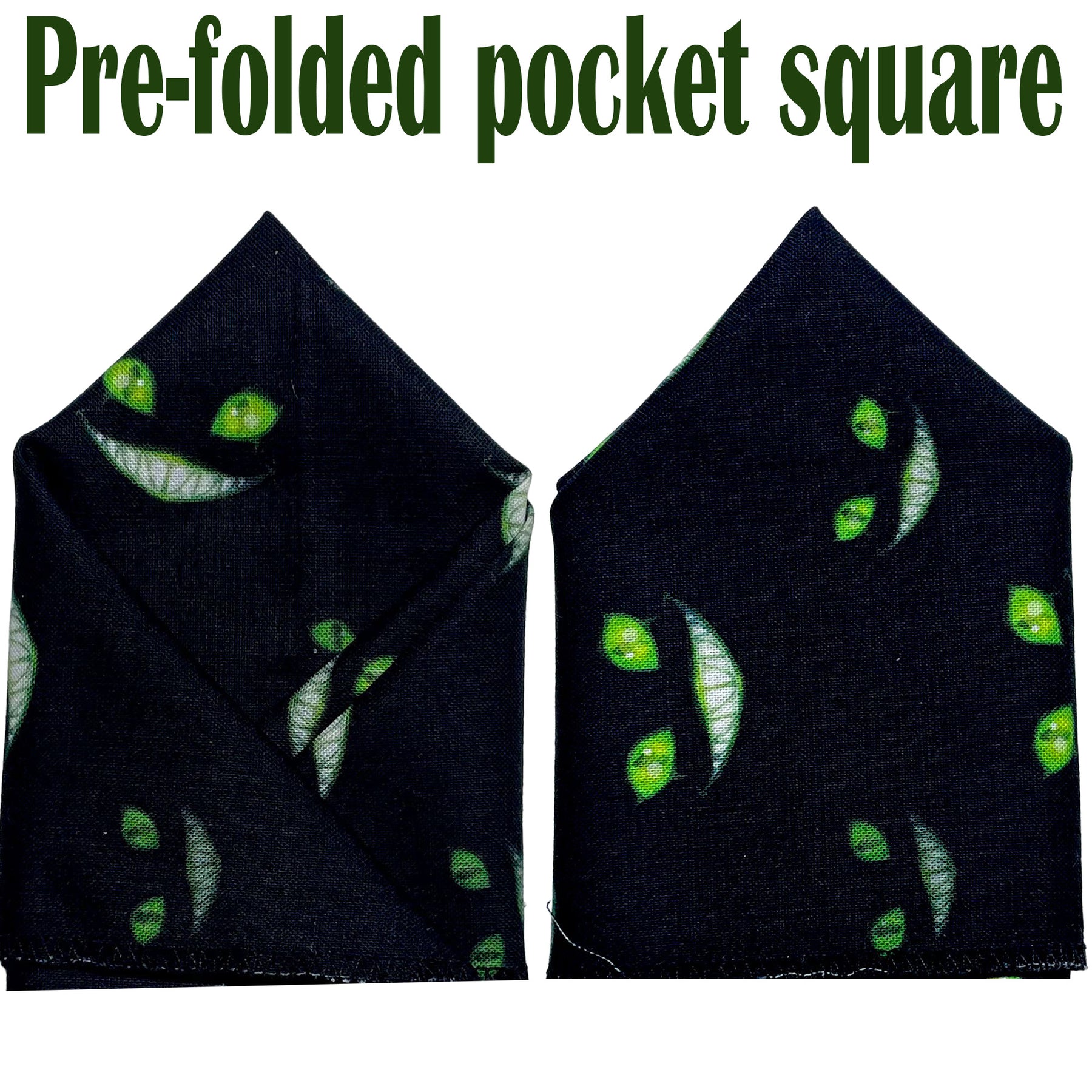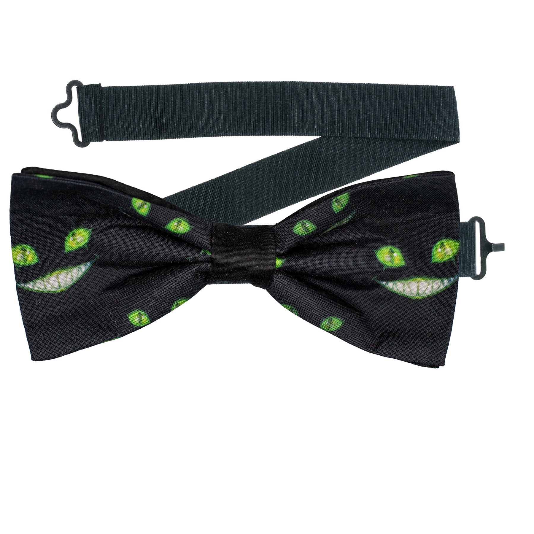 Great designer bow tie & pocket square, black fabric with a green cheshire cat style sinister grins on black cotton fabric.  The pocket square is approx. 25 x 25cm, pre-folded so you can pop it straight in your breast pocket. Handmade from 100% Cotton