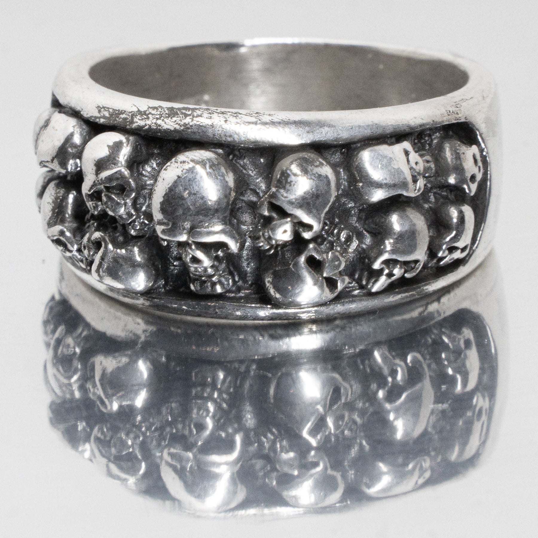Cluster of 13 skulls on a 925 sterling silver ring band.  Out of the 13 there is 1 large skull in the centre with 3 rows of 2 skulls on either side